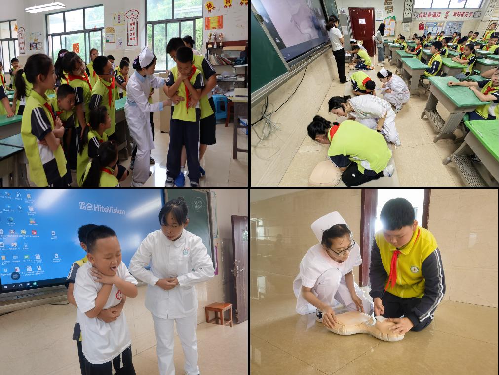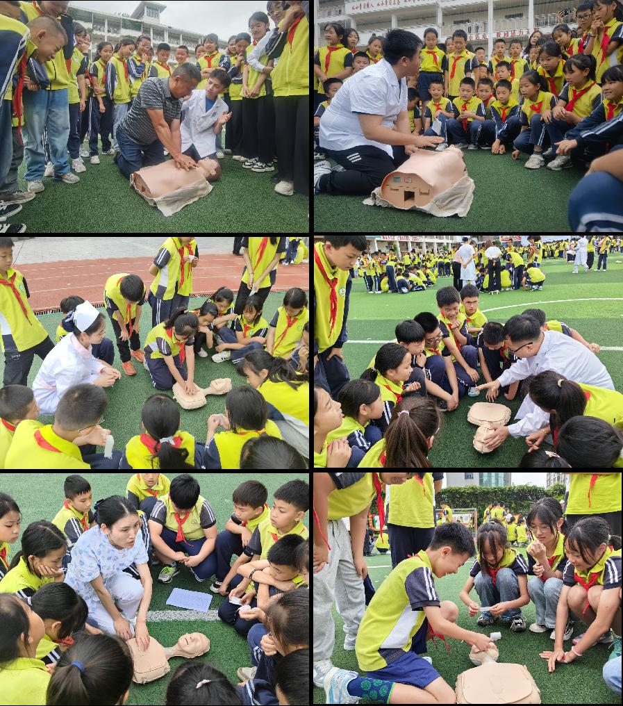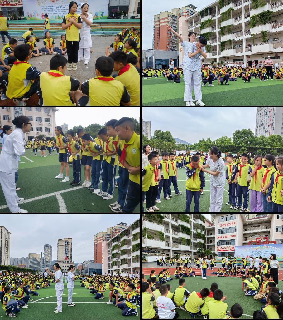 急救知识进校园守护生命伴成长仪式结束,学院师生分别在操场、教室采用“理论讲解+模拟示范+操作体验”的方式进行急救知识培训。针对三、四年级学生,师生们用通俗易懂的语言结合动作示范讲解了海姆立克急救法,如何用“剪刀-石头-布”的方法确定位置,如何以正确的操作冲击患者腹部直至排出异物,并指导700余学生完成操作体验。针对五、六年级学生,师生们讲解了什么是急救“黄金四分钟”,并借助人体模型演示了心肺复苏的操作步骤,600余名师生积极参与模拟演练,对于按压姿势、按压位置等问题均一一指导。