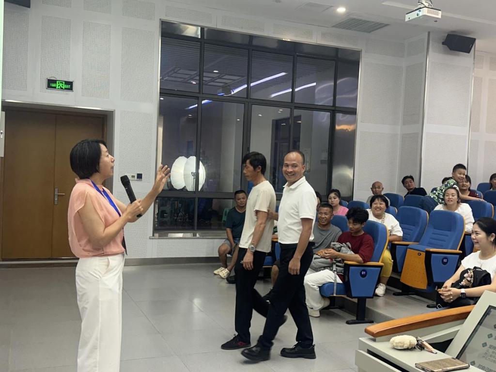学生第二党支部书记、2025级辅导员权明桃老师就学生管理相关制度进行说明,并通过“信任同行”游戏互动——一位家长闭眼,由另一位家长引导走向讲台,寓意着在大学阶段家长应学会目标引导,适当放手,培养孩子的独立能力。这一环节生动温馨,引发家长广泛共鸣。