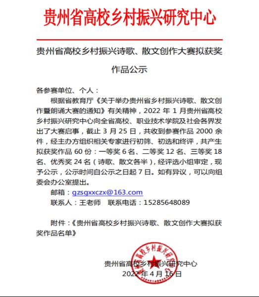 脱贫攻坚的号角吹响在神州大地,乡村振兴的使命召集我辈青年,贵州省在打赢脱贫攻坚战中,创造了无数奇迹。贵州省高校乡村振兴研究中心面向全省举办了“贵州省乡村振兴诗歌、散文创作暨朗诵大赛”。金年会硕士研究生刘颖、严欣、张鹭采用散文的艺术形式积极参赛,其作品《莺初解语,最是一年春好处》歌颂了金年会jinnianhuicom硕士研究生毕业后扎根基层,助力乡村振兴做出的积极贡献,表达了对乡村振兴的真挚情感和深情祝愿,荣获散文类“”三等奖”。