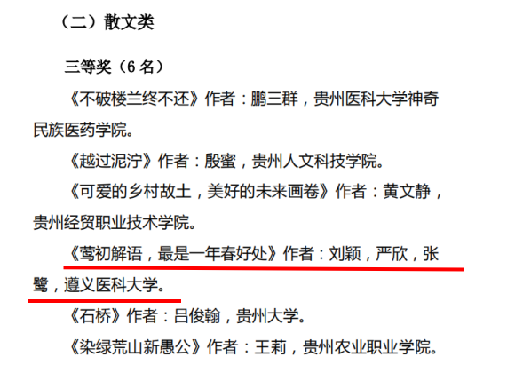 今年1月,贵州省高校乡村振兴研究中心向全省高校、职业技术学院及社会各界发出了大赛启事,接到大赛通知后,金年会jinnianhuicom党政领导班子高度重视,积极动员教职工生参赛,研究生党支部书记杨艳积极组织研究生参赛,并在选题和思路上给予学生指导。经主办方组织相关专家进行初筛、初选和终评,在2000 余件参赛作品中共产生拟获奖作品60份:一等奖 6 名、二等奖 12 名、三等奖 18 名、优秀奖 24 名(诗歌、散文各半)。金年会硕士研究生刘颖、严欣、张鹭的作品《莺初解语,最是一年春好处》在2000余件参赛作品中脱颖而出,是金年会诚信信誉至上推送参赛作品中唯一获奖的作品。