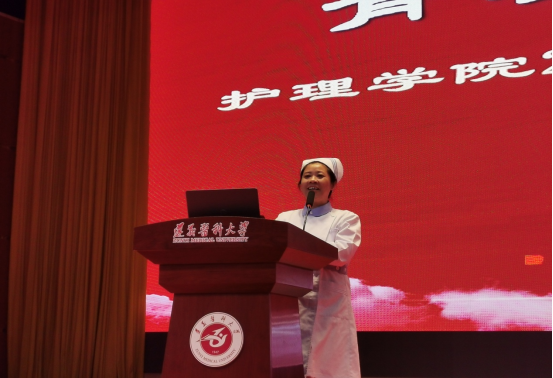 活动在庄严的国歌声中拉开序幕。学院党委书记张咏梅为本次大会致辞,她代表学院领导班子向全院师生表达了节日的问候和最深切的祝福,并要求全院师生要听党话、感党恩、跟党走,敢于担当,勇于接住历史的接力棒,砥砺前行,不负韶华、不负时代、不负人民,为健康中国建设贡献自己的青春力量。学院党委副书记、院长邓仁丽发表讲话,她指出全院师生要时刻牢记自己的初心和使命,秉持“护行於仁、理知于爱”的院训,学好专业知识,练就过硬本领,时刻为守护人民健康准备着。