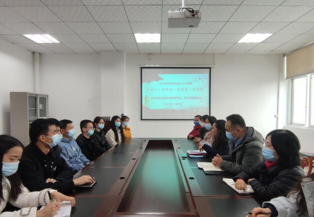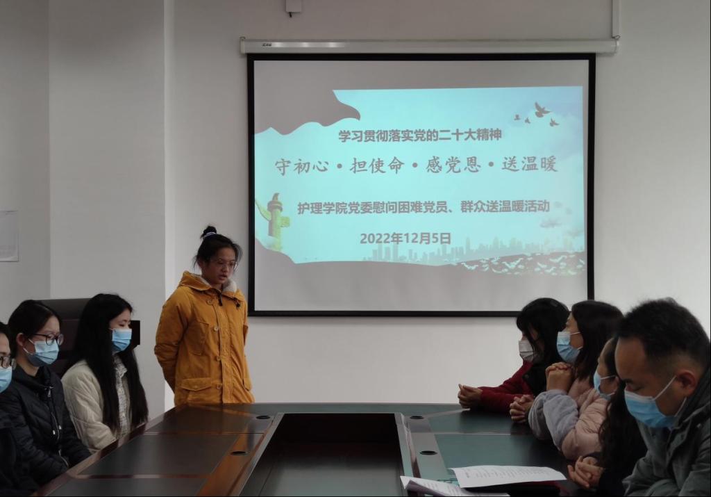 为深入贯彻落实党的二十大精神,推动党的二十大精神在基层落地生根,帮助大学生树立自信自强的坚韧品格,引导青年学生听党话、感党恩、跟党走。2022年12月5日12:30,金年会jinnianhuicom党委在党员活动室开展了“守初心·担使命·感党恩·送温暖”慰问困难党员、群众送温暖活动。金年会jinnianhuicom党委书记张咏梅,党委副书记陈伟,党委委员、学生第二党支部书记权明桃,研究生党支部书记杨艳,学生第三党支部副书记、团委负责人陈娅,各年级辅导员及15名困难党员、群众参与了本次慰问活动。