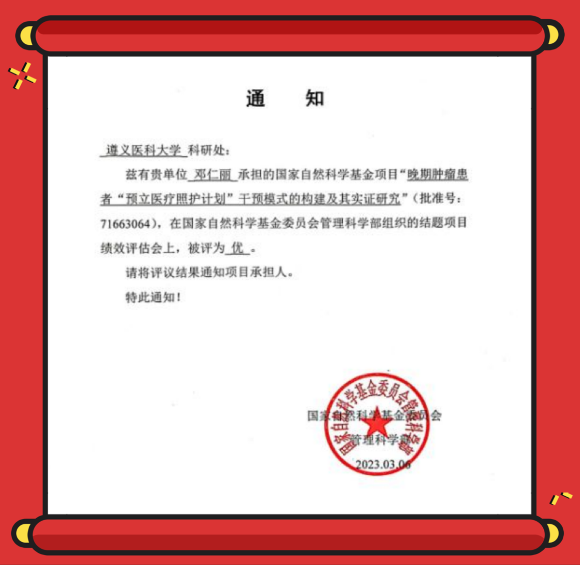 日前,金年会博士生导师邓仁丽教授主持的国家自然科学基金项目《晚期肿瘤患者“预立医疗照护计划”干预模式的构建及其实证研究》,在国家自然科学基金委员会管理科学部发布结题项目绩效评估中被评为“优秀”,这是学校首个获评“优秀”的结题项目。国家自然科学基金委员会每年获评优秀项目数仅占当年结题项目总量的20%左右,主要从项目研究水平、成果质量等进行绩效评估。
