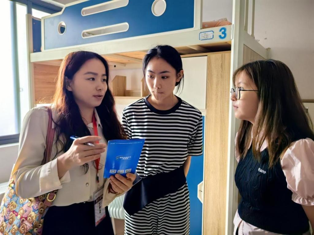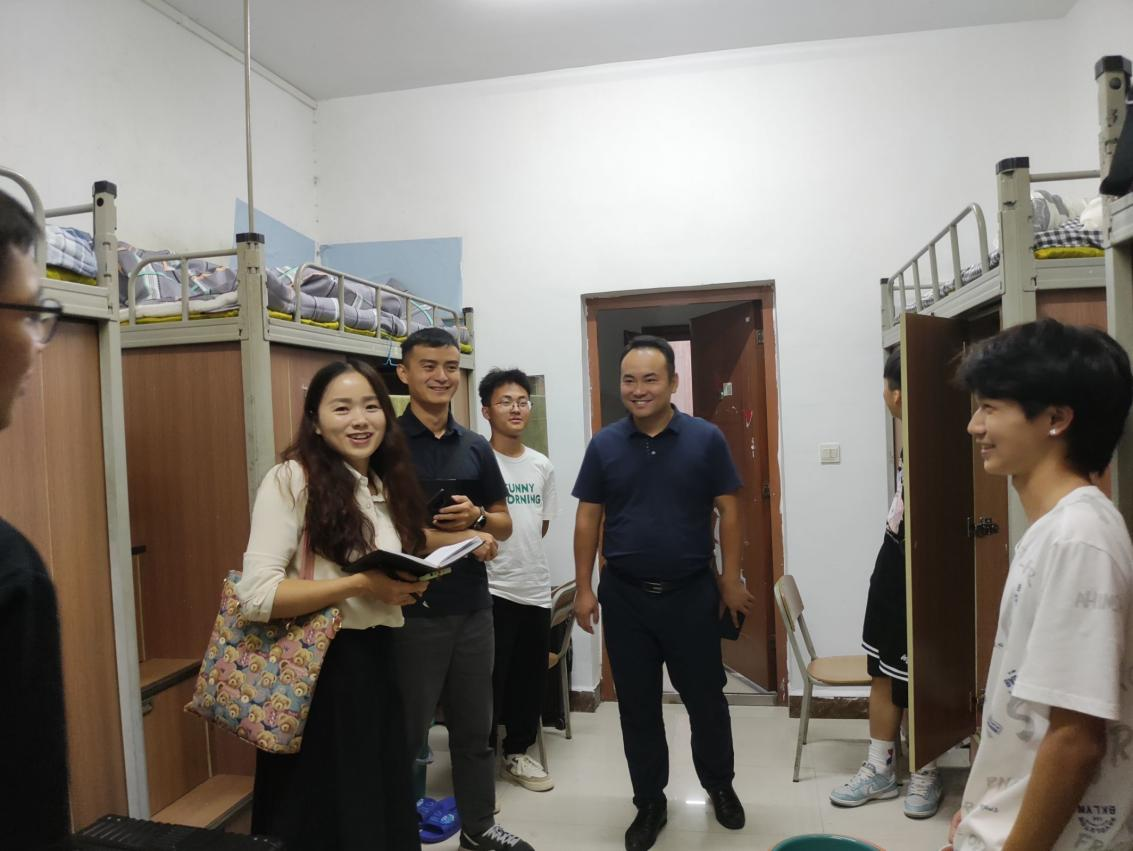走访寝室送温暖,贴心问候显关怀。13日19:00,在学院党委副书记陈伟的带领下,年级辅导员和学生兼职班主任一同走访了新生寝室。陈伟书记一行查看了学生的住宿情况,并向萌新们耐心解释了近期关于宿舍分配、四六人间收费、空调安装等问题,亲切询问了萌新们吃得好不好、住得习不习惯、睡得香不香等问题。同时,提醒萌新们要注意寝室、校园交通、网络等安全,尽快适应新环境、新生活。