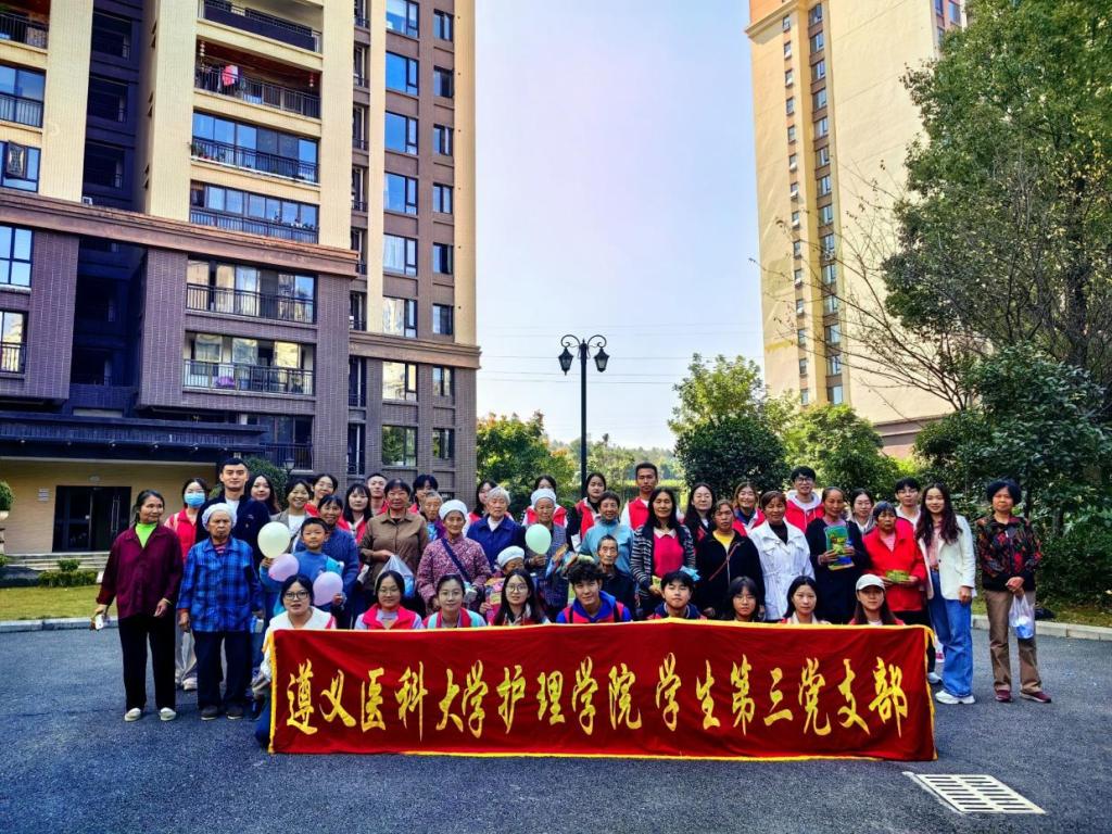 为引导学生在实践课堂中受教育、长才干、作贡献,继承和弘扬尊老、爱老、敬老的中华传统美德。2023年10月21日,金年会jinnianhuicom学生第三党支部走进遵义市新蒲新区新中街道中建幸福城社区开展了“情暖重阳节,浓浓敬老情”重阳节活动,支部30余名师生党员参与了活动。