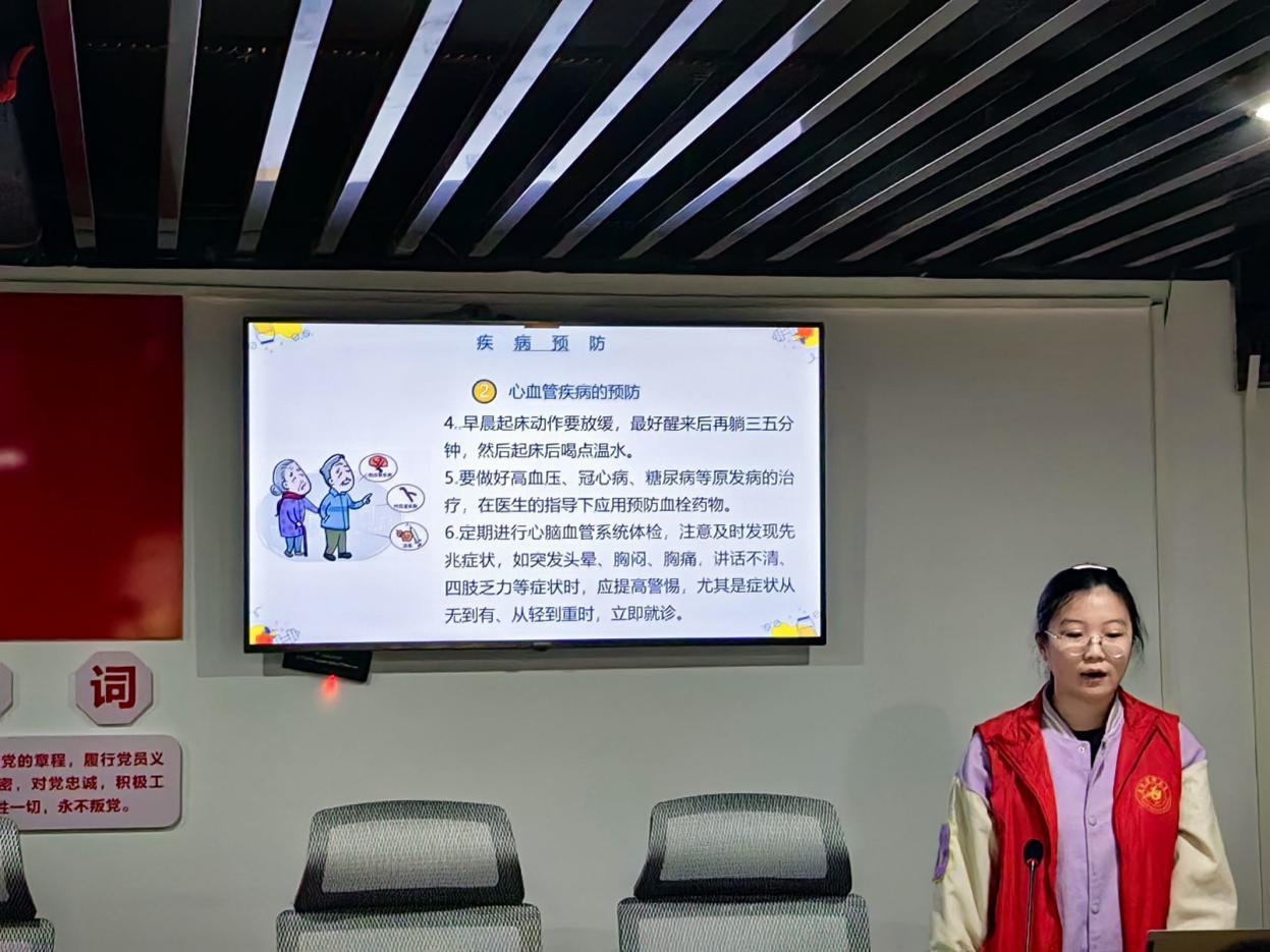 宣讲健康知识,关爱老人健康。上午10:00,支部学生党员在社区会议室为社区老党员宣讲秋冬季常见疾病类型、预防措施以及秋冬季养生保健等健康知识。同时,大家纷纷走进社区,给社区老人宣传疾病预防、心理健康、睡眠健康等知识,帮助老人们提升健康意识,引导老人们保持乐观、开朗的积极心态。一句句暖心的话语,一声声关切的问候,让老人们在秋冬之际感受到了浓浓的温暖和爱意。