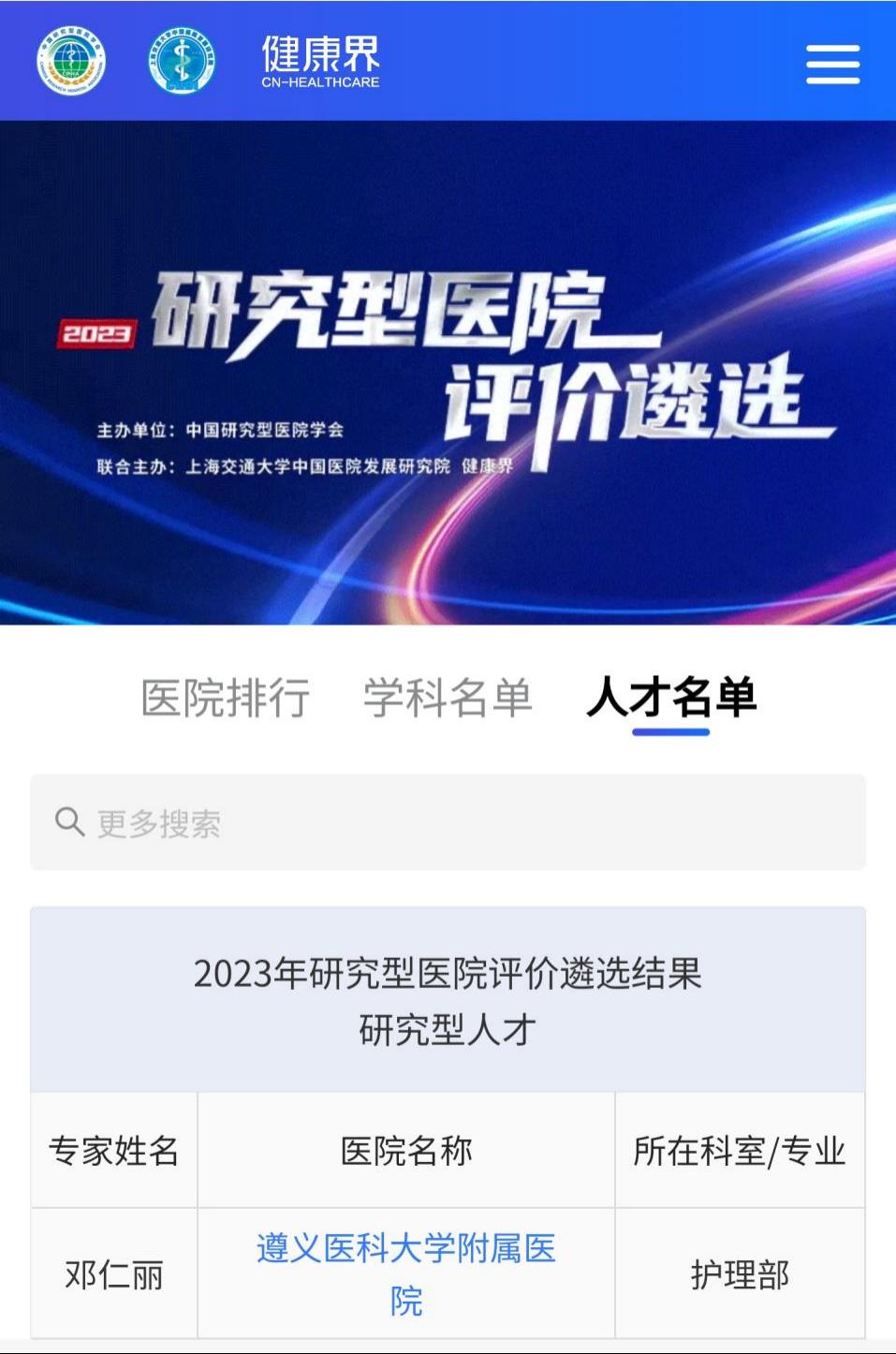 10月21日,由中国研究型医院学会联合上海交通大学中国医院发展研究院、健康界共同开展的2023年研究型医院评价遴选结果出炉。金年会jinnianhuicom党委副书记/院长、附属医院护理部副主任邓仁丽教授入选研究型人才榜单。