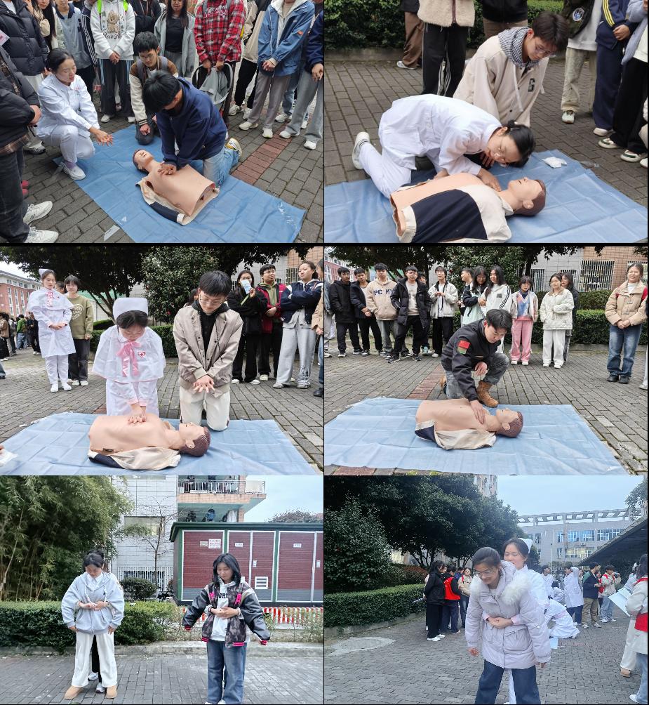 活动现场,陈伟副书记讲话,希望同学们通过对急救知识的学习,树立敬畏生命、尊重生命的责任意识,勉励同学们要珍惜实践机会,将课堂所学转化为服务社会的本领,用专业守护健康,用爱心传递温暖。此次活动邀请了附属医院急诊科教师何婧、程婷、王玉林,她们结合实际案例,用通俗易懂的语言向师生们详细讲解了心肺复苏法、海姆立克急救法、“急救神器”AED的使用等常见急救知识,并带领10名学生志愿者进行了急救技能示范与教学。在分组实操演练中,师生们踊跃参与,通过模拟人道具练习急救手法,并逐一进行指导,现场学习氛围热烈。同时,活动还穿插了心理健康疏导、艾滋病预防知识宣讲等环节,帮助师生树立科学健康理念,增强自我防护意识。