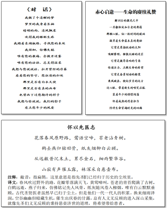 为更好地表达师生对医学先辈们的缅怀之情,学院开展了为期五天的“清明寄思”诗歌创作活动。活动得到了全院师生的积极响应和热情参与,纷纷用诗歌的形式抒发内心的敬仰与怀念。其中《怀以先医志》《标本室里的清明雨》等作品,以真挚的笔触展现了医者对“生命至上”职业信念的坚守,展现出后辈传承医德医风的坚定决心。活动通过古现代诗歌载体,有效深化了师生对医学精神的理解与认同。