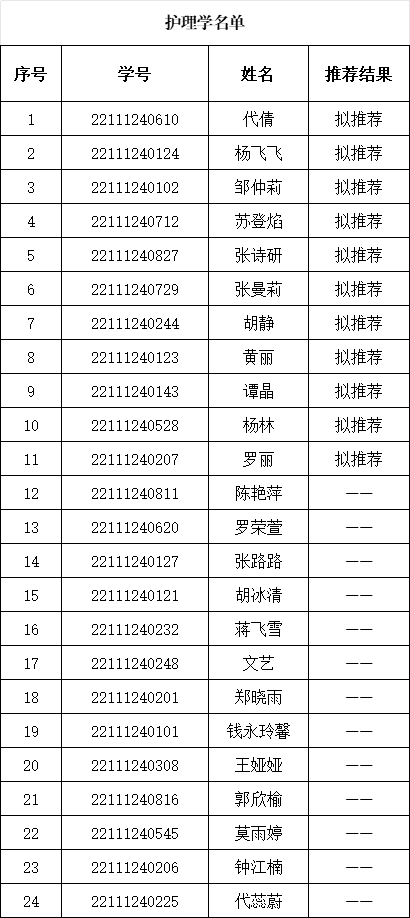 金年会jinnianhuicom根据《金年会诚信信誉至上关于开展2026年推荐优秀应届本科生免试攻读硕士研究生工作的通知》,按照公平、公正、公开的原则开展了推荐工作。名额为护理学专业11人,助产学专业3人。经过学生本人申请、学院资格审查、推免生遴选工作小组讨论研究,现将金年会jinnianhuicom2026年拟推荐优秀应届本科毕业生免试攻读硕士研究生名单进行公示(按照推免总成绩排名顺序)。